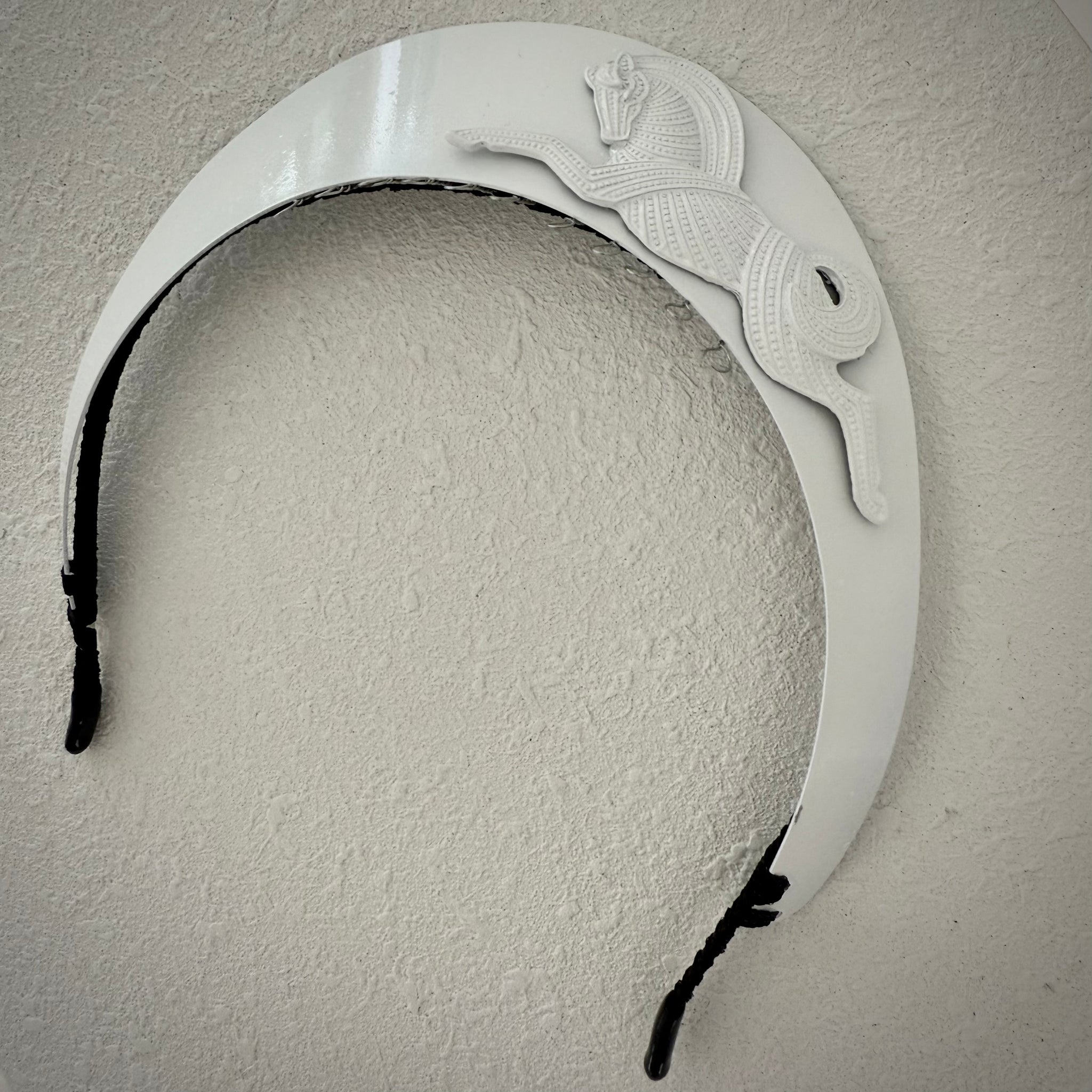 Our Phar Lap crown is the perfect headpiece for this spring carnival! She features a vintage horse leaping across a white metal halo, creating a majestic crown. This headpiece would exude elegance, sophistication, and power, truly befitting a queen's presence. It would be a breathtaking statement piece, commanding attention and admiration wherever it's worn. Part of our Looking Glass collection.