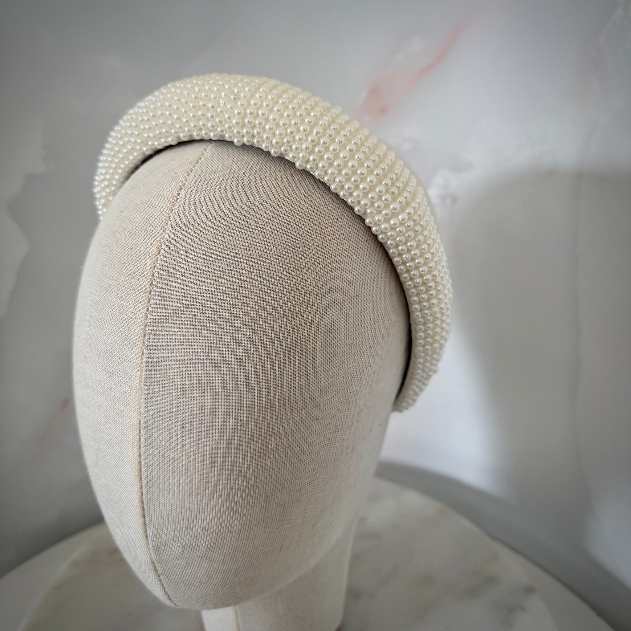 Elevate your style with our exquisite pearl-adorned headband, a perfect fusion of classic charm and modern sophistication. This headband is meticulously crafted with a satin, padded base and adorned with an array of small, round faux pearls, creating a look that's both luxurious and refined. A comfortable headband for the races.